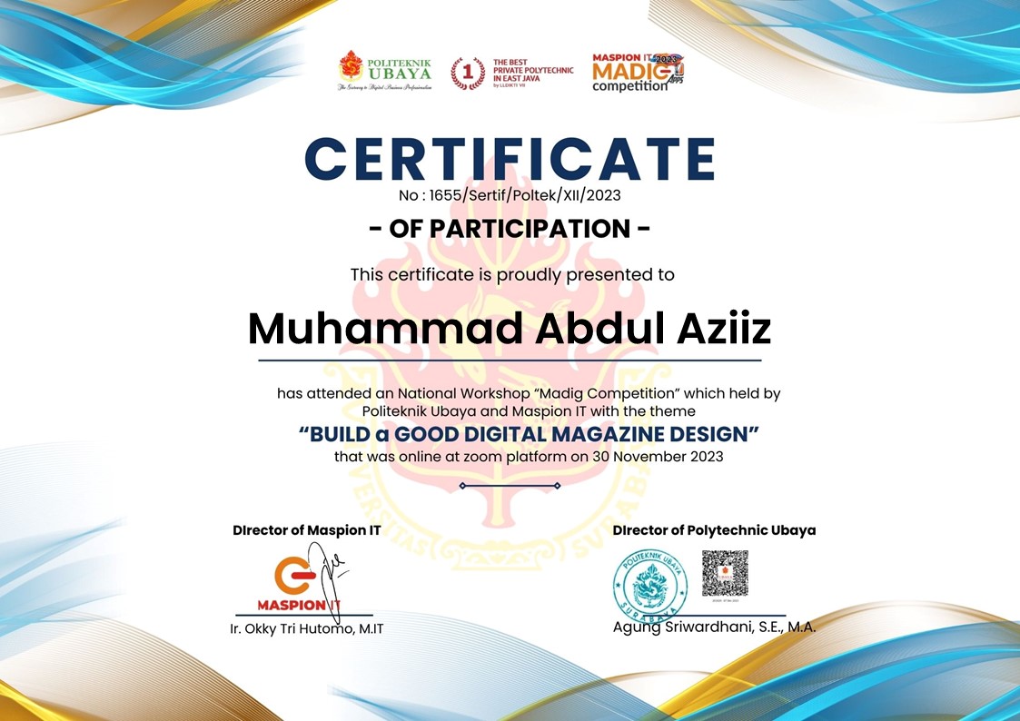 Diberikan karena telah mengikuti Workshop Nasional yang diselenggarakan oleh Politeknik Ubaya dan Maspion IT dengan tema BUILD A GOOD DIGITAL MAGAZINE DESIGN secara daring (online) pada tanggal 30 November 2023.