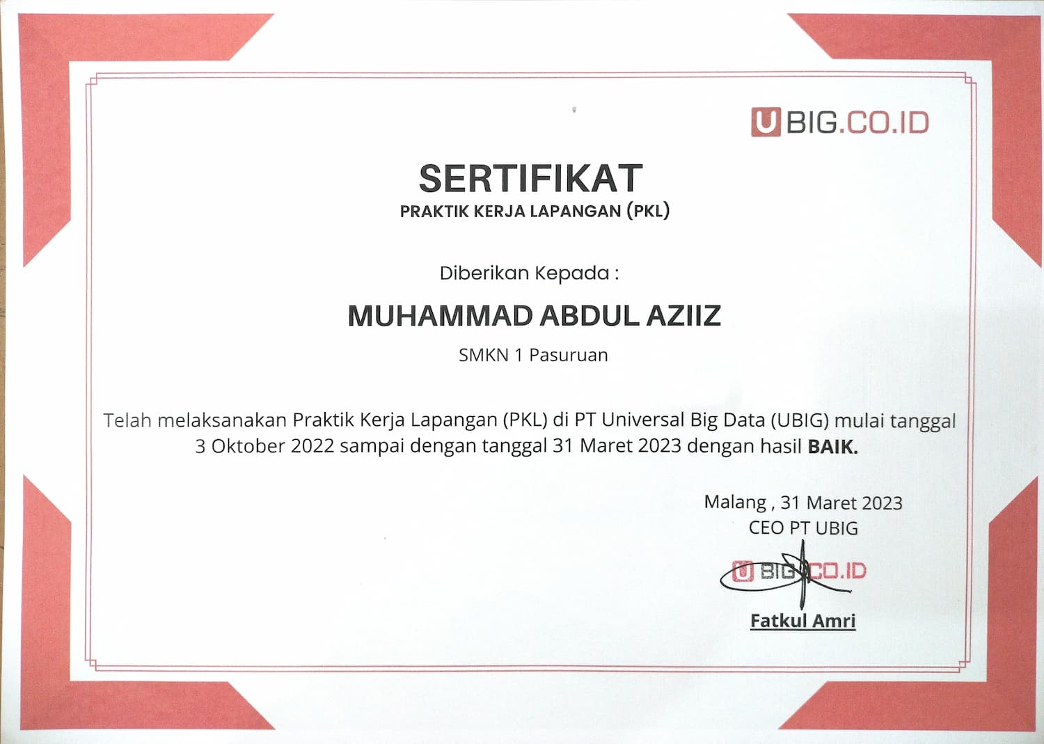 Diberikan karena telah melaksanakan Praktik Kerja Lapangan (PKL) mulai tanggal 3 Oktober 2022 sampai dengan tanggal 31 Maret 2023 dengan hasil BAIK.